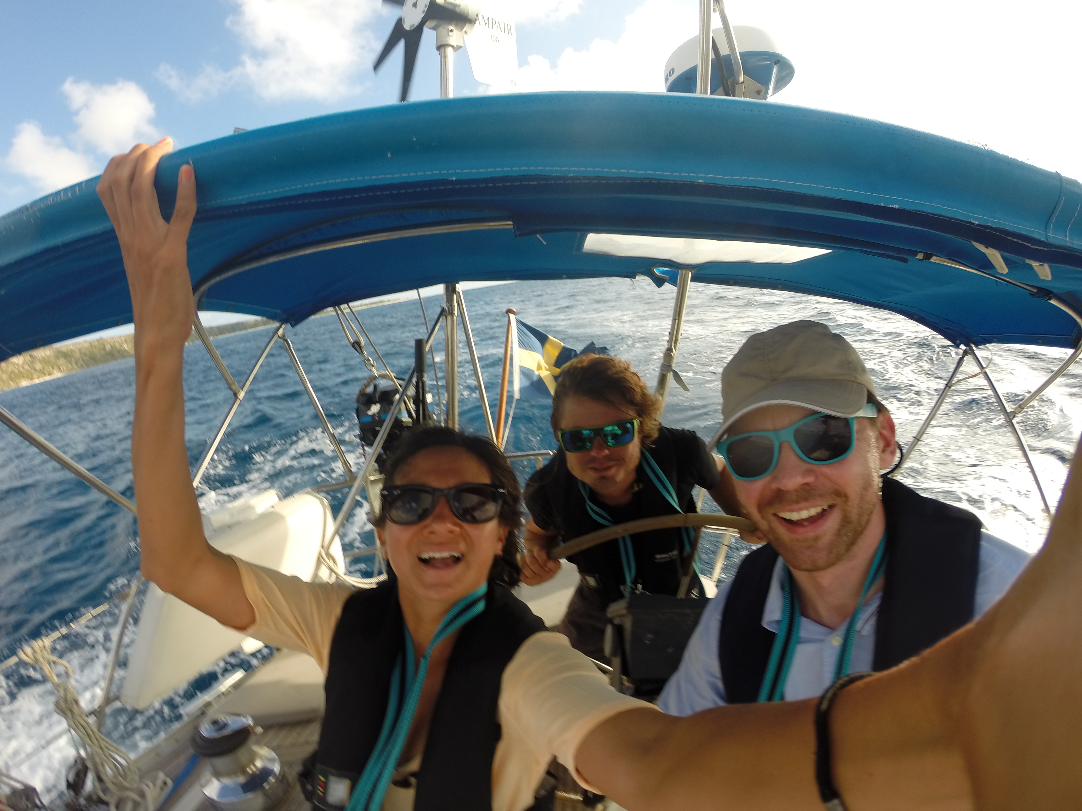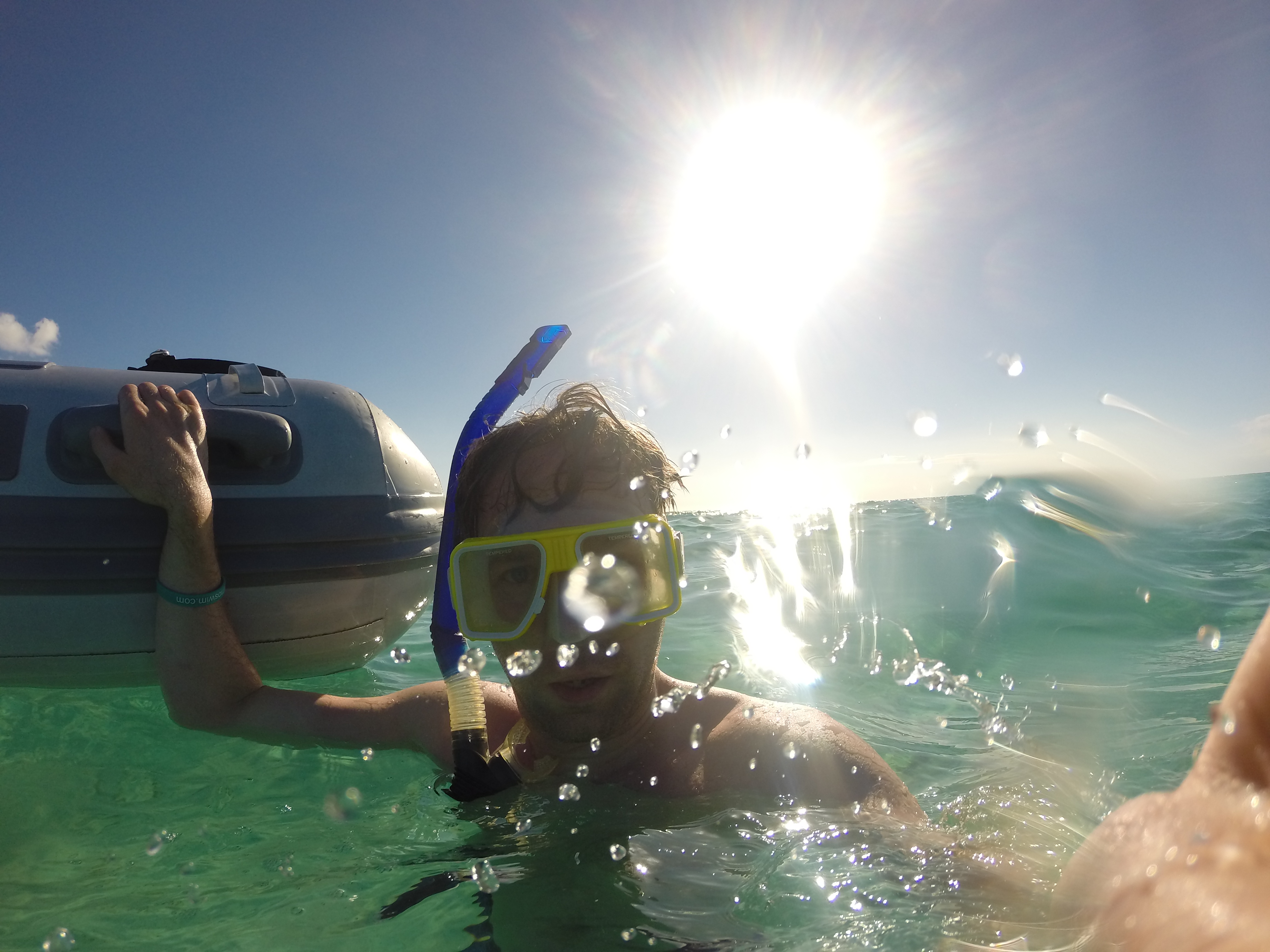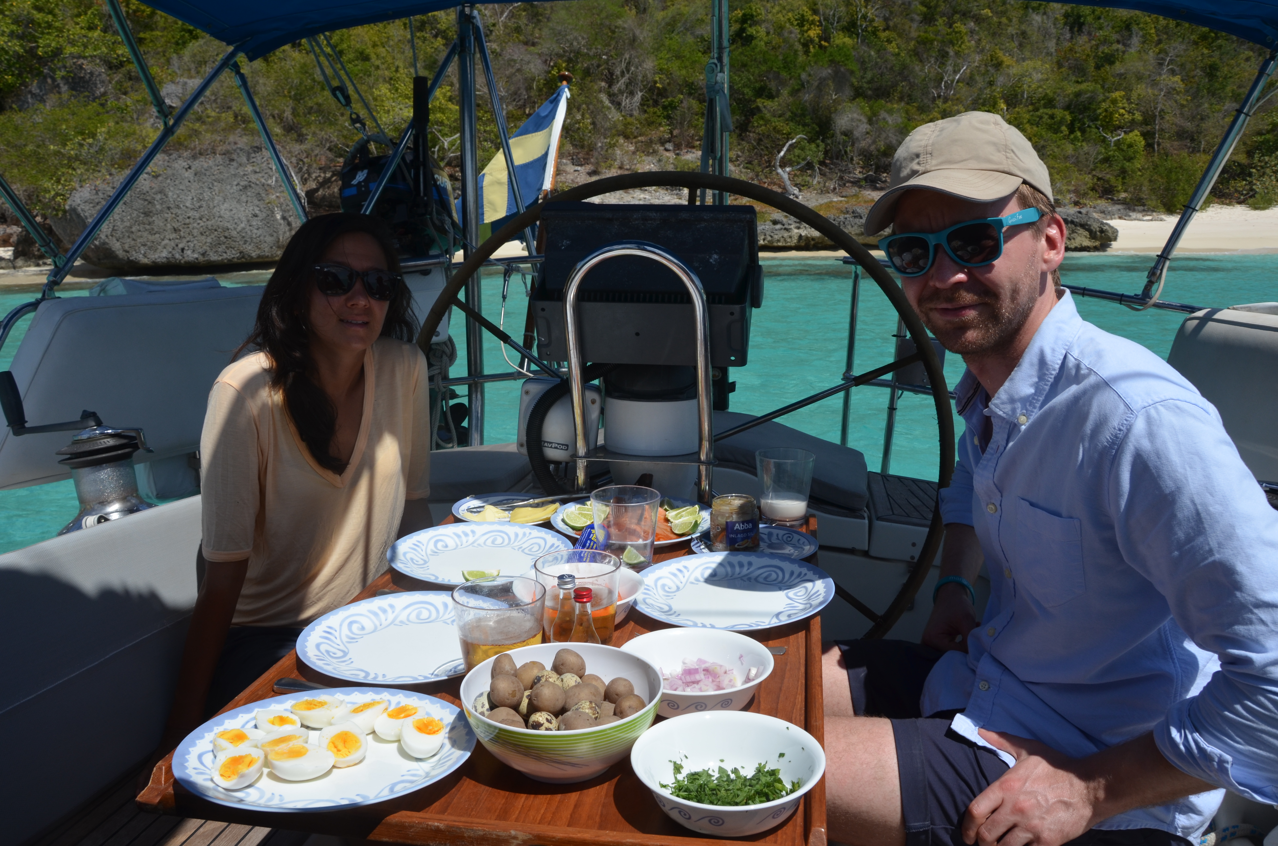 Påskafton bjöd på snorkling, Johans fnittrande med go pron i högsta hugg för selfiesbilder och ännu en simtur för Erik in till Rangerkillarna för att ladda ned ett väder via deras satellit och i smyg boka en ny flygybiljett åt Johan från Puerto Rico eftersom vi inte skulle hinna till St Thomas. Därefter en fullmatad påsklunch med sill, lax, ägghalvor, smuttandes på snaps och knäckebröd m.m. i strålande sol och vindlä. Humöret var nu på topp.
