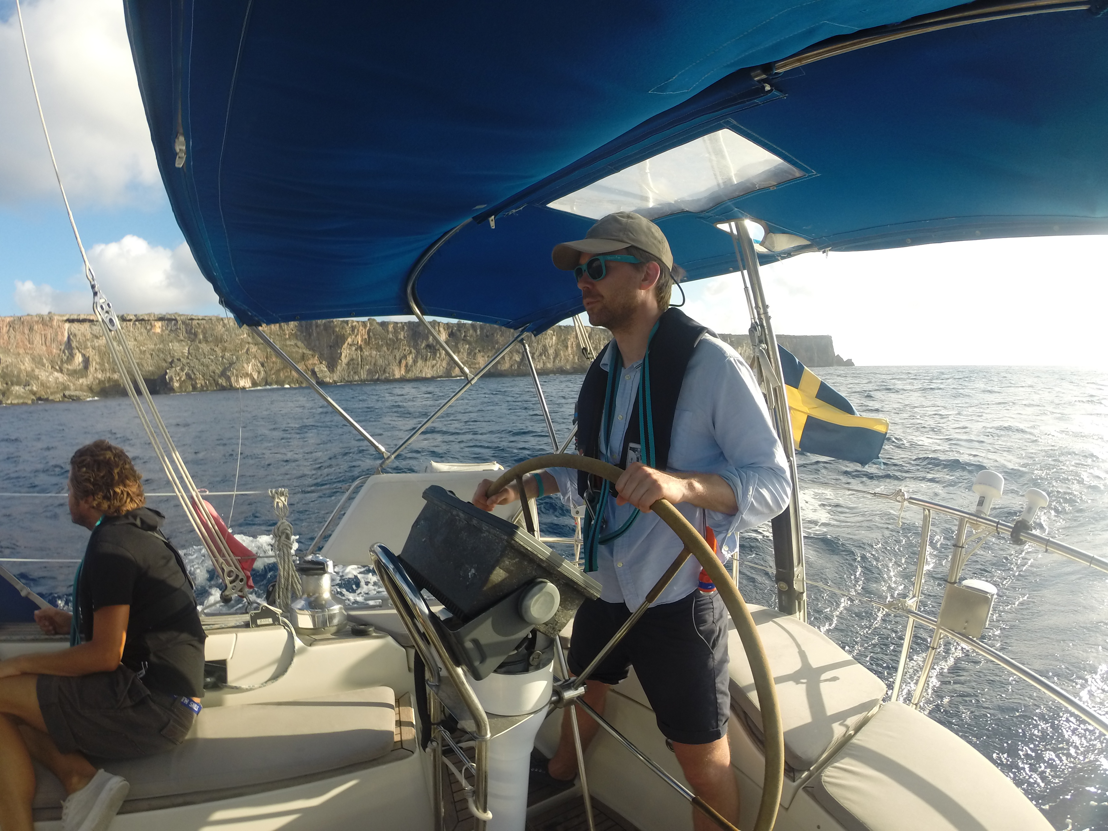 Lätt nervösa, med allt tredubbelt sjösurrat, sjökojerna uppe och middagen förberedd tog vi oss ut på havet vid femtiden kvällen efter. Att segla runt hörnet på ön var helt magisk med dess mäktiga grottformationer och höjd.