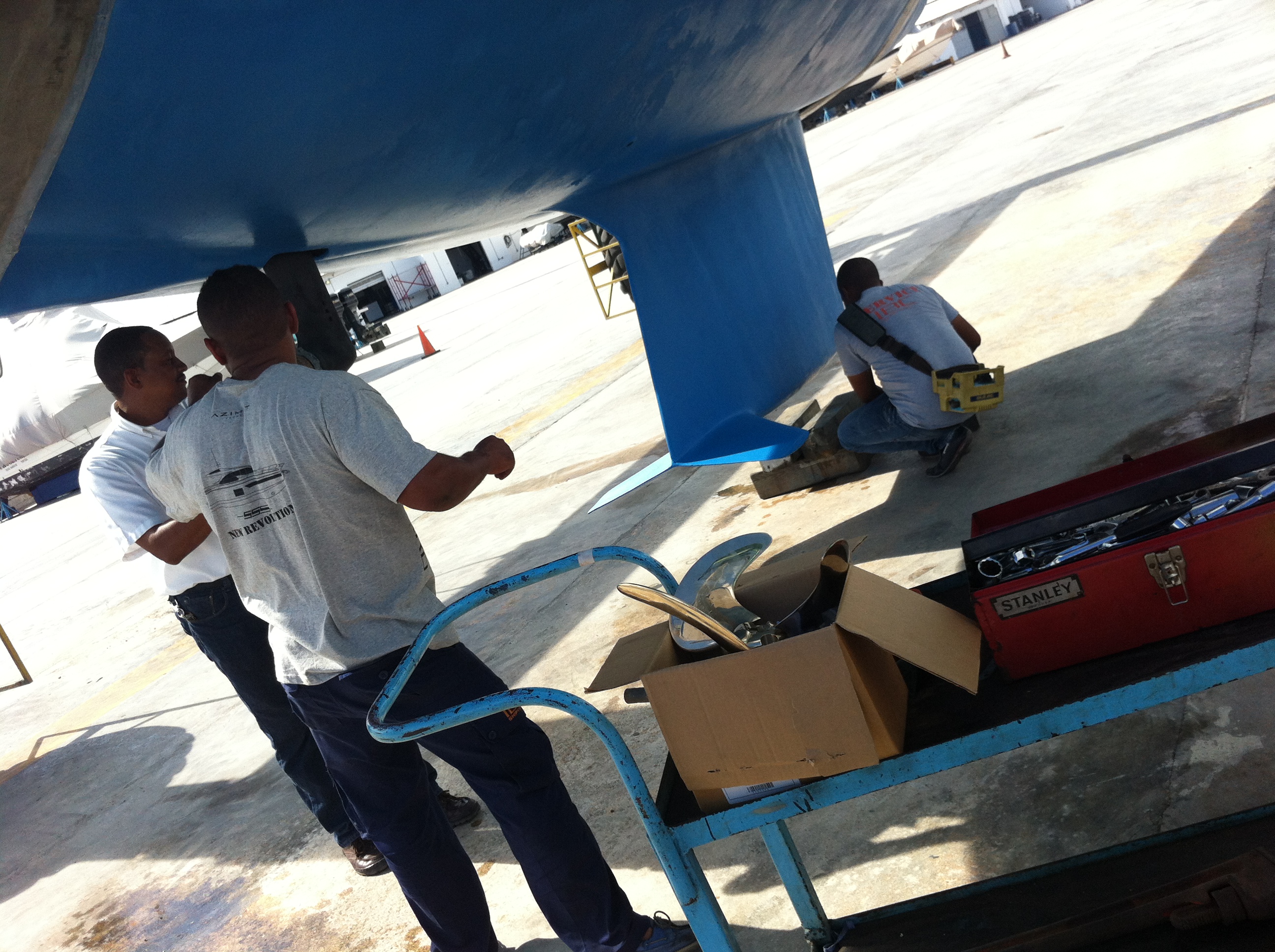 Krismöte följde på krismöte, espresso efter espresso konsumerades tillsammans med Mauro, VD för inte bara marinan utan även återförsäljare för italienska lyxyachter (93 fot och uppåt). Efter mycket dividerande och diskuterande av alternativa lösningar beslutade vi att montera tillbaks vår gamla propeller, sjösätta Gåva, segla vidare i Dominikanska och köpa ny biljett till Johan istället för till Puerto Rico. Vi blev lovade att propellern skulle kunna monteras inom några dagar och vi skulle då kunna segla vidare med Johan mot St Thomas – Virgin Islands. Trots att vi inte kom iväg var vi ändå glada att vi hann möta upp Eriks f.d. kollega från flottan på middag – Rikard med flickvän Alexandra som båda två bor i Santo Domingo.