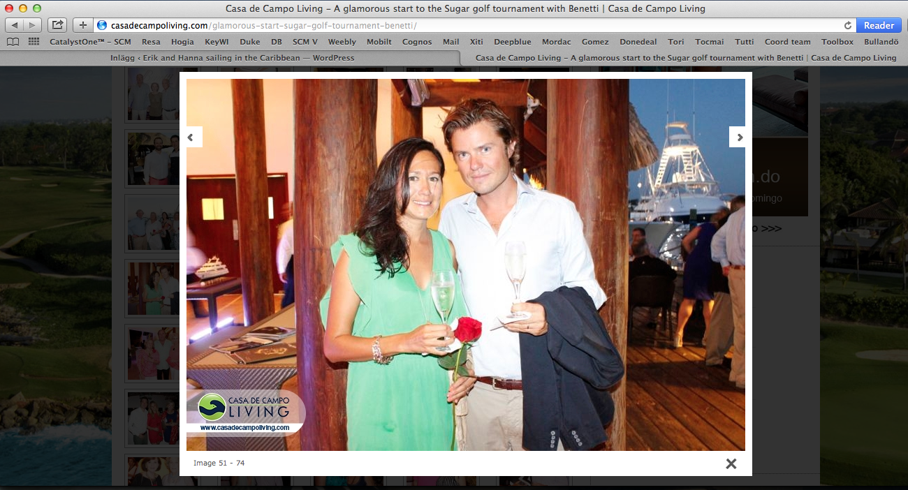 Erik och Hanna poserar i Dominikansk skvallerpress – som plåster på såren för allt strul bjöd Mauro oss på italienskt superyacht cocktail mingel (vi gick all in…prosecco…snittar…rödvin…mer snittar)