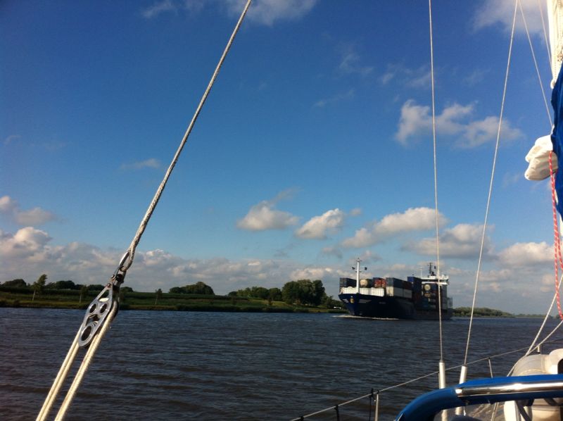 Aningen nervösa iakttog vi hur den stora kryssaren (som även den skumpade hejdlöst i sjöarna) girade runt Gåva för att inspektera oss. Snart blev vi uppropade på VHF 16 och snabbt förberedde vi oss på att rabbla allt från passnummer till reg.bevis, eller t.o.m. att bli bordade.